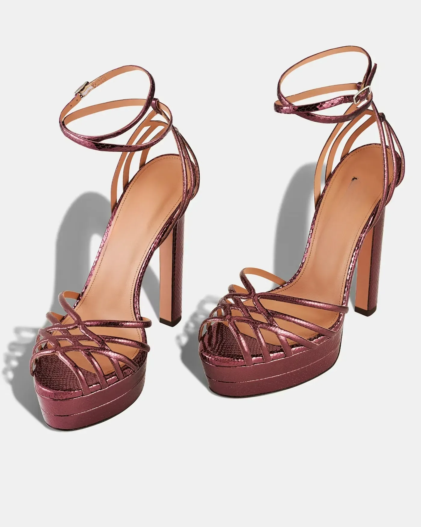 I nostri sandali con plateau Wild Dream hanno un’elegante allure retrò, grazie al tacco a blocco di 130 mm e al plateau robusto. Realizzati in pelle metallizzata effetto serpente in un ricco color bordeaux, i sottili cinturini conferiscono un tocco di leggerezza a questa silhouette audace e di grande impatto.