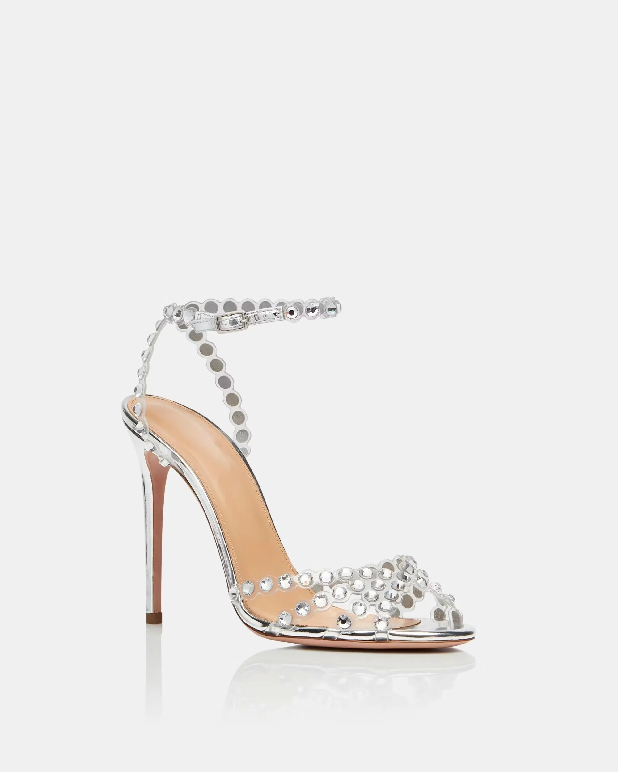 I nostri sandali Tequila Plexi non passano inosservati. Realizzati con cura in Italia in pelle specchio lucida color argento scintillante e PVC trasparente, questo modello sofisticato è impreziosito da scintillanti cristalli sui sottili cinturini, una fibbia regolabile alla caviglia e poggia su un seducente tacco a spillo.