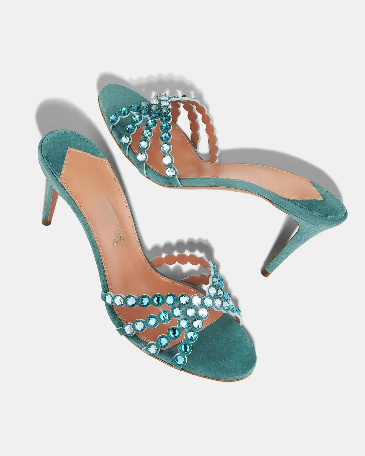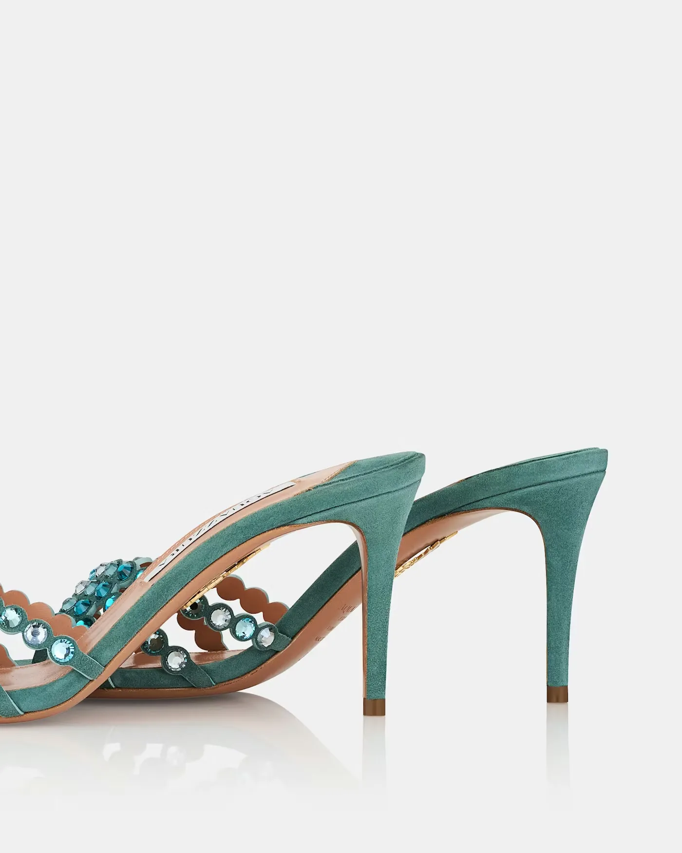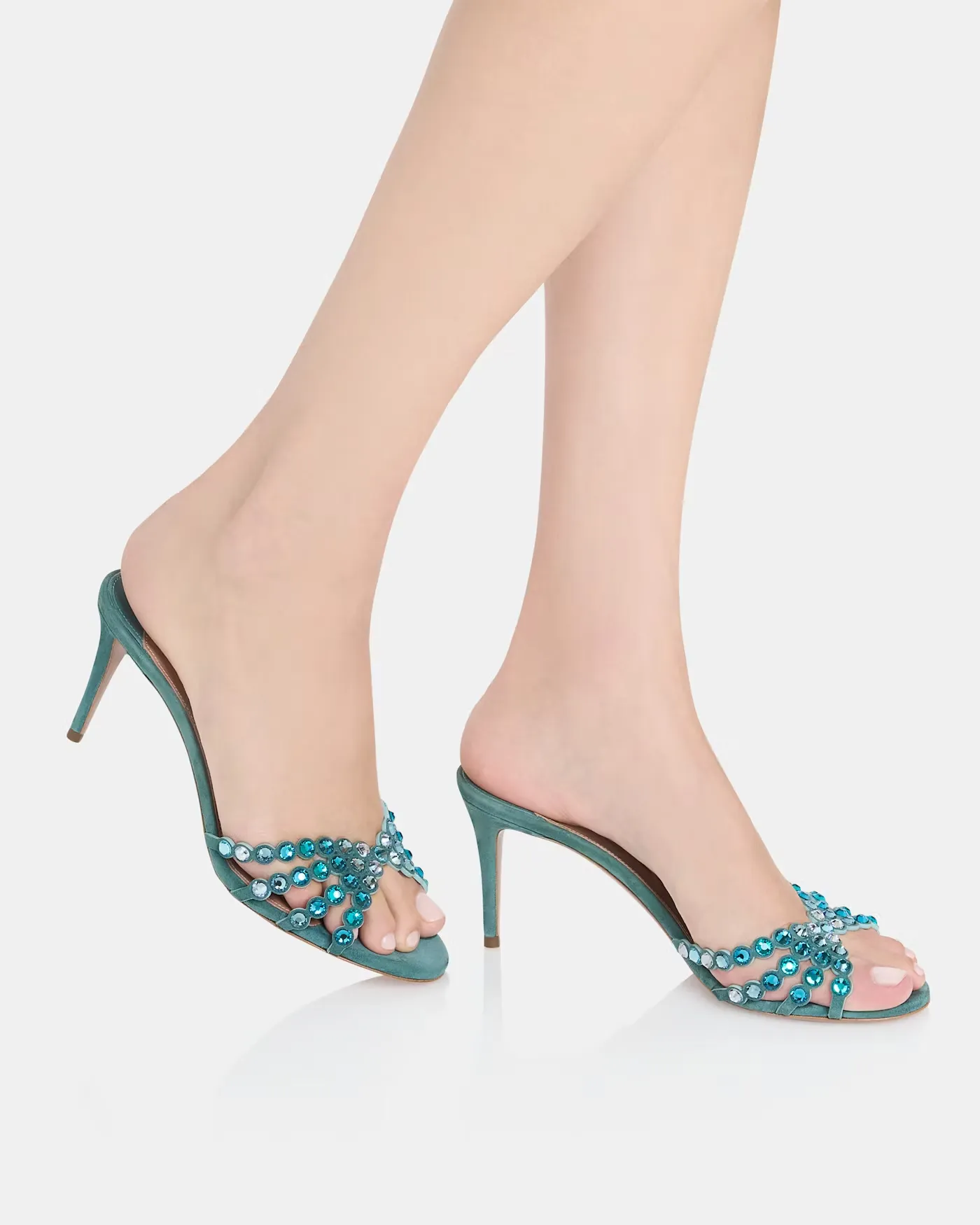 Le Tequila Mule tornano in una veste fresca e di tendenza, realizzate in morbida pelle scamosciata verde acqua e caratterizzate da cinturini ondulati impreziositi da scintillanti cristalli tono su tono. Questo modello minimalista ma glamour poggia su un comodo tacco medio, unendo con disinvoltura l’eleganza da sera al fascino delle notti in città. Perfette per fare un’entrata in grande stile e per le serate che si protraggono fino a tardi.